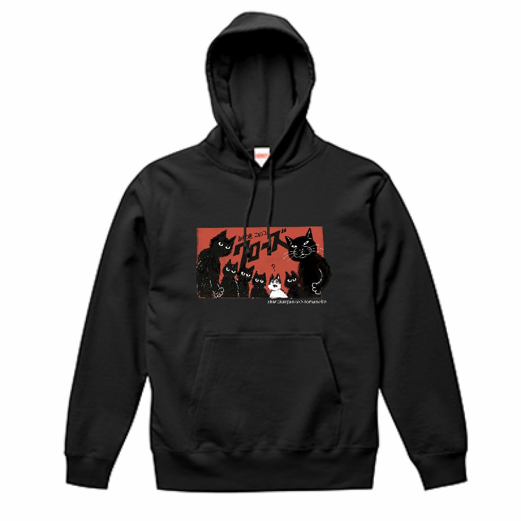 黒猫好きの方に送る、黒猫だらけのパーカーです。あかつきニャンコさんのあんよちゃんがワイルドをメインにワイルドに描いてみました。